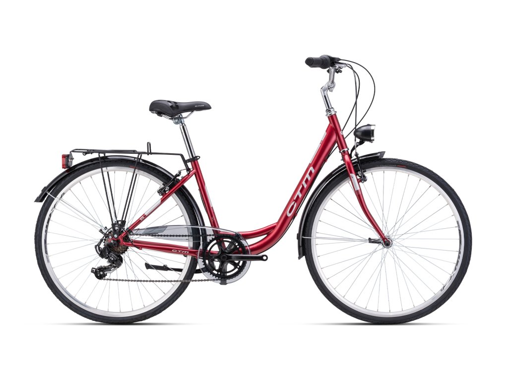 Dámské trekingové kolo CTM RITA 1.0 modelový rok 2025 v tmavě červené perleti se stříbrnými doplňky je postavené na 26-palcových kolech. Model nabízí nízký rám a  je kompletně vybavený blatníky, nosičem, stojanem, předním a zadním světlem.