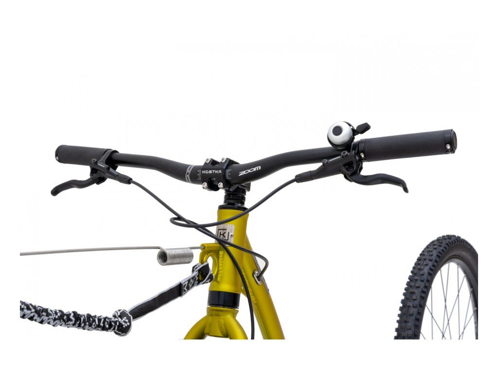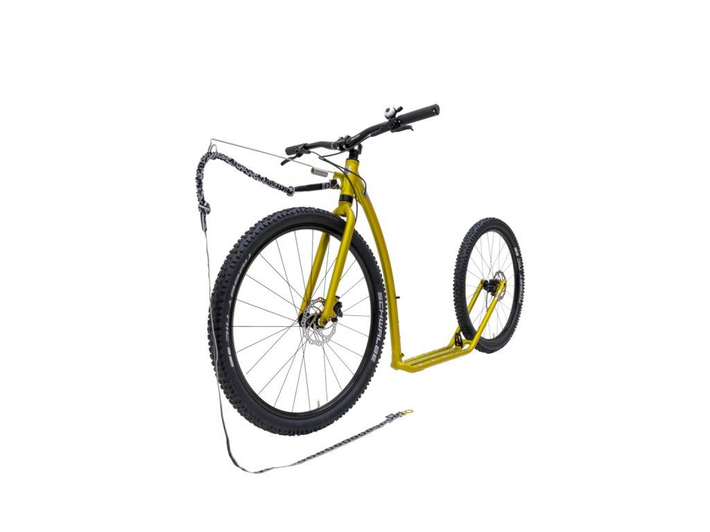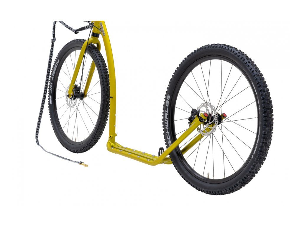 Konstrukce byla pečlivě laděna ve spolupráci s profesionálními mushery, což se odráží v integrovaném oku pro uchycení vodítka a amortizéru, jenž je standardní součástí balení pro optimální přenos tažné síly. Díky osazení velkými koly 29/27,5“ a špičkovými MTB plášti Schwalbe Nobby Nic koloběžka suverénně zvládá i ty nejrozbitější lesní cesty a bahnité úseky. Hybridní technologie rámu spolu s novou hliníkovou vidlicí KOSTKA AERO efektivně tlumí mikrovibrace, zatímco 12mm pevné osy s unikátním systémem Mag Ends zajišťují dokonalou torzní tuhost a přesné řízení.